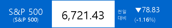 • S&P 500, -78.83포인트(-1.16%) 하락한 6,721.43